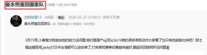 球迷直呼:崔永熙可以重回国家队了。“小崔复出我就说他的能力没问题,绝对是国产sg顶尖3d,今晚的很多高级动作大家看了,也只有他能做出来吧?郭士强坐镇现场,jacky打日本台湾都可以进名单了,打完常规赛季后赛越来越好,最起码顶胡明轩没问题。”诸位,你对崔永熙今天的表现,有何评价?